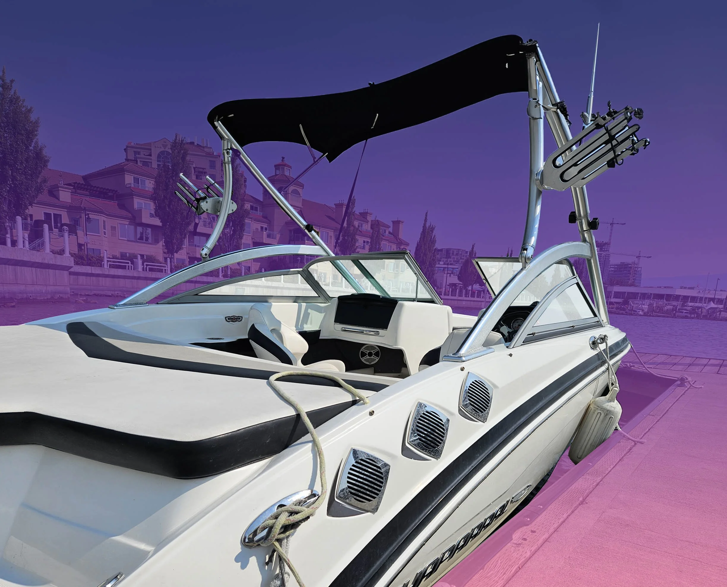 Four Winns tower boat perfect for wakeboarding, tubing, and cruising on Okanagan Lake.